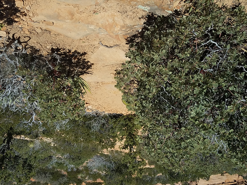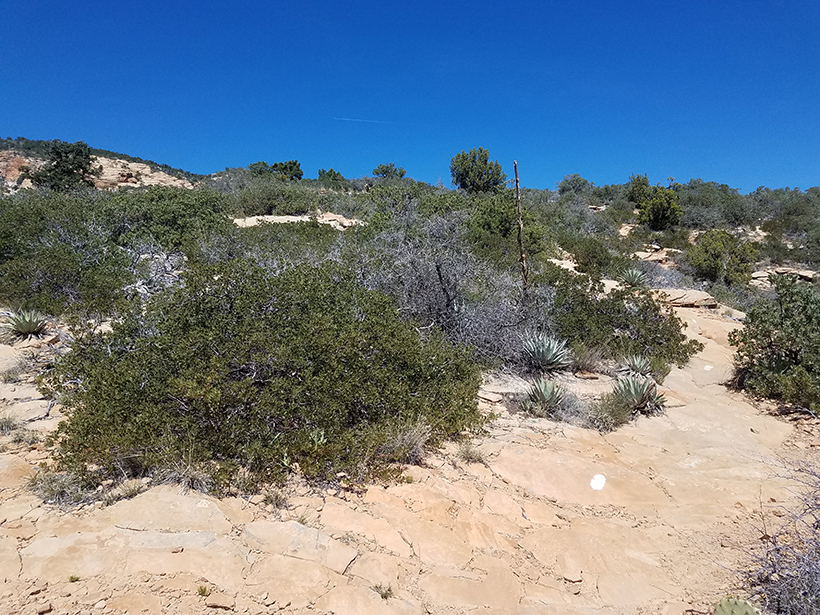 The end  of Bear Mountain Trail is shown above.  The two asterisks are at trail end (Trail Peak) and on a small rise before the final Trail Peak.  The change in elevation to the small peak is 1400 feet.  Fay Canyon is to the east of the small peak (right).  As the hike continues, the hiker climbs another 600 feet with Fay Canyon to the east (right) (the change in elevation is approximately 2000 feet).  The two yellow arrows designate the two portions of the trail which have the final two stone steps which need to be traversed.